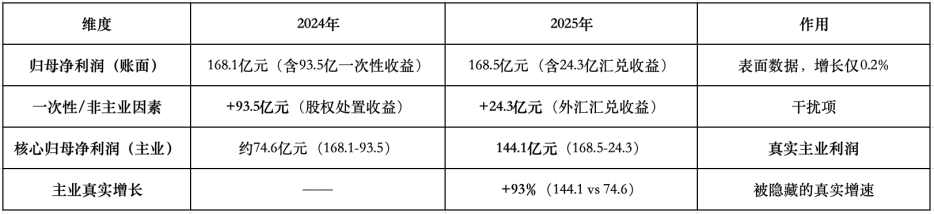 据了解,这个“核心”扣除了人民币汇率波动带来的24.3亿元外汇汇兑净收益。与此同时,2024年归母净利润曾包含93.5亿元的股权处置一次性收益,形成高基数。这两项因素共同导致账面利润增速失真,剔除两边的一次性“噪音”后,核心归母净利润从2024年的约75亿元(估算)跃升至2025年的144.1亿元,主业盈利能力实际实现了近翻倍的增长。