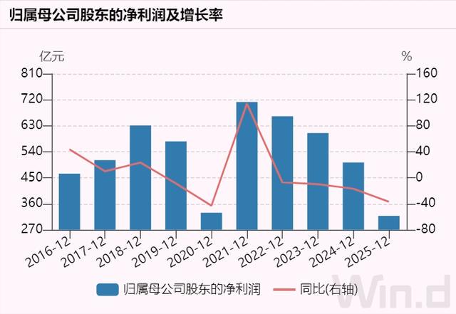 其营业利润大约405亿元,同比上一年的723亿元大约少318亿元或44%;归母净利润318亿元,锐减37%,则是四连降,和2021年超过700亿元净利润相比,降幅大约是55%。