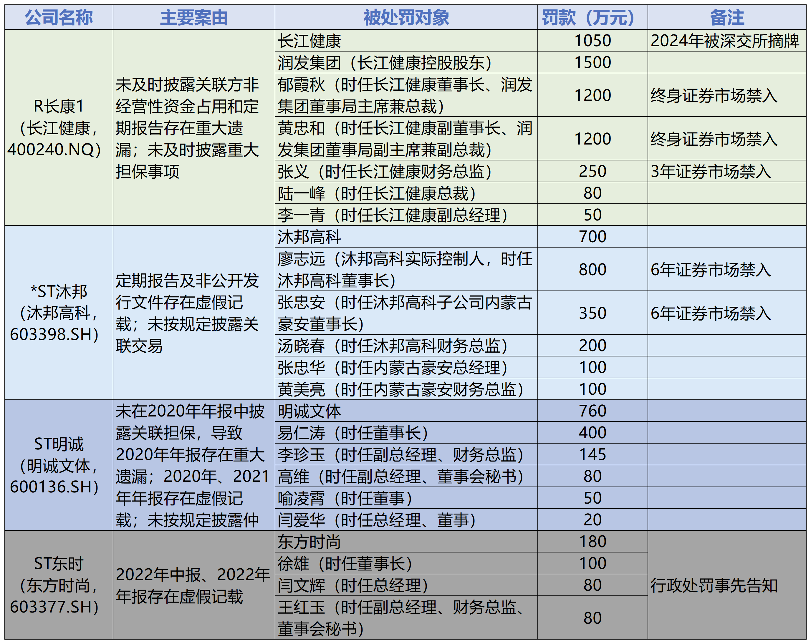 长江健康因未及时披露关联方非经营性资金占用、定期报告存在重大遗漏,未及时披露重大担保事项,被江苏证监局处以1050万元罚款;其控股股东润发集团被罚款1500万元;5名责任人共被罚款2780万元,其中时任长江健康董事长、润发集团董事局主席兼总裁郁霞秋,时任长江健康副董事长、润发集团董事局副主席兼副总裁黄忠和,分别被罚款1200万元,并都被采取终身证券市场禁入措施。