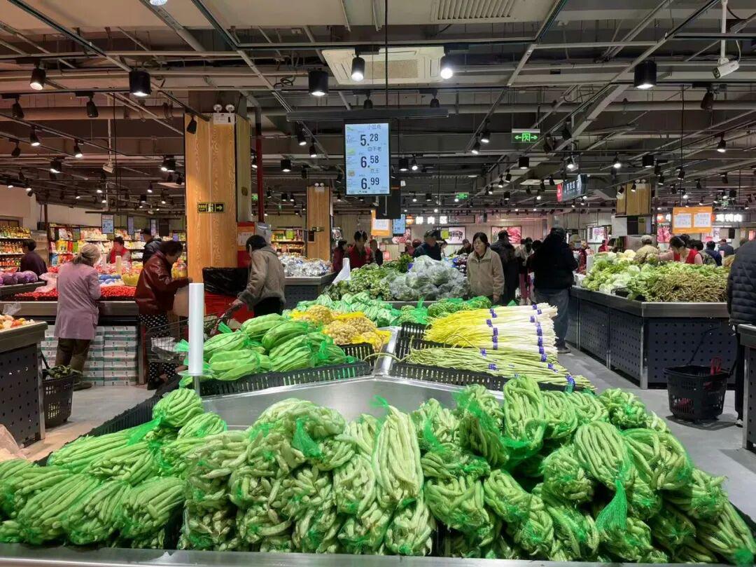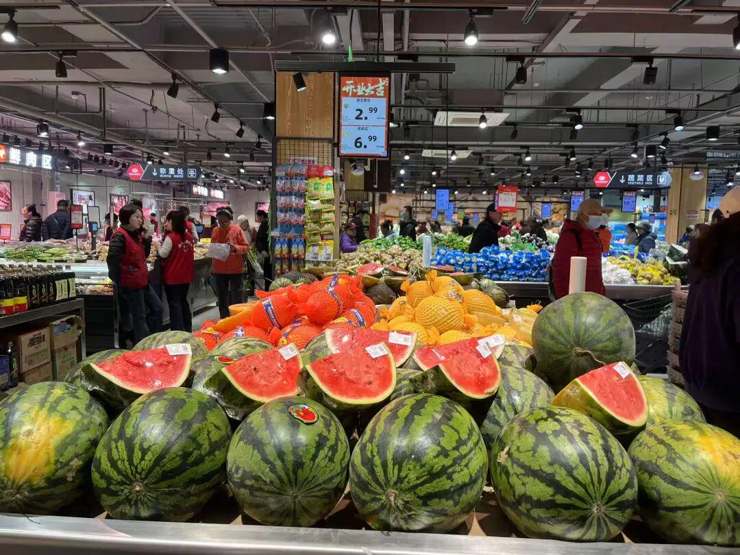 顾客围合在散卖蔬果堆头挑挑拣拣,店员此起彼伏的促销叫卖,购物车与小推车的熙攘交错,店员拉着推车货框挤进人流补货,蔬果的清新果香混杂炒栗子熟食卤味不断氤氲上升,整个超市的氛围就是一个菜市场早市的复刻重现。
