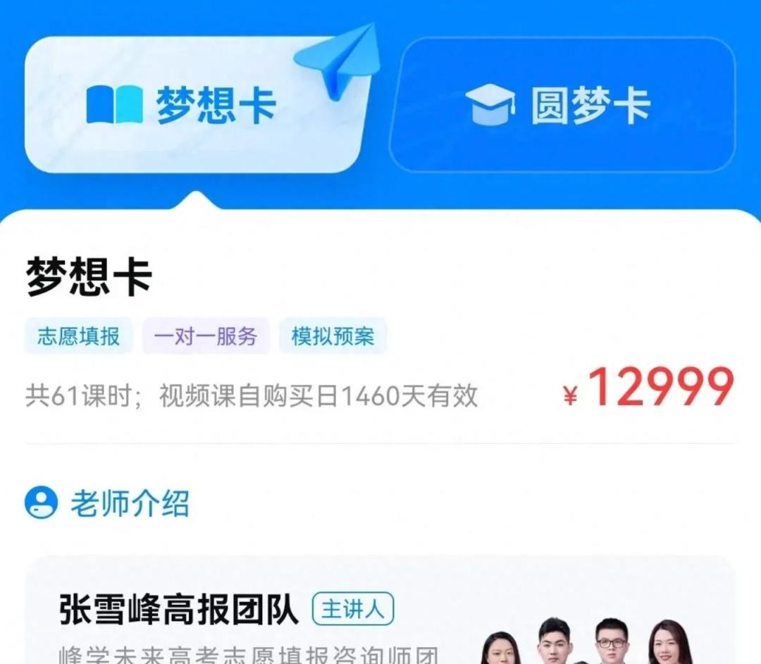 据腾讯《深网》报道,2024年高考季,张雪峰直播间推出的11999元的梦想卡和17999元的圆梦卡,2万个高考志愿填报服务名额在3小时内售罄,创下3小时收入2亿元的销售神话。