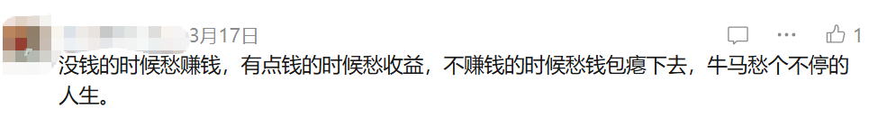 在上一篇推文()后,我发现评论区有一些焦虑:“没钱的时候愁赚钱,有点钱的时候愁收益,不赚钱的时候愁钱包瘪下去,牛马愁个不停的人生。”