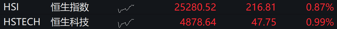 恒生指数高开0.87%,恒生科技指数涨0.99%。洛阳钼业涨近7%,农夫山泉涨逾6%,老铺黄金涨逾5%,紫金矿业、商汤涨逾3%。
