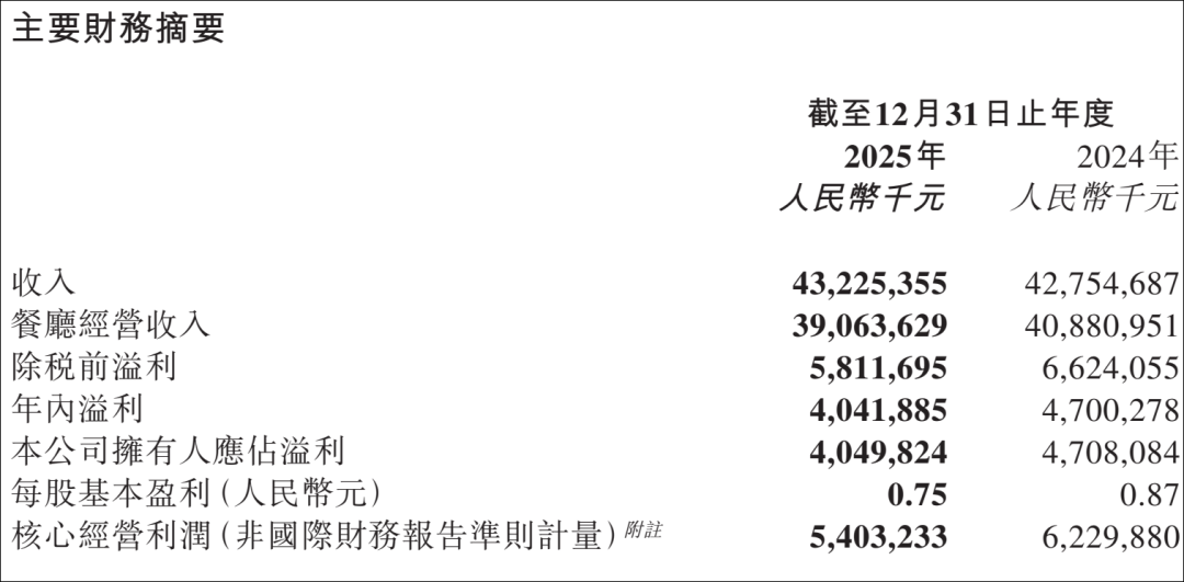 2025年海底捞实现了营收的稳健增长,收入432.25亿元,同比增长1.1%。但,利润已经承压。公告显示,海底捞核心经营利润为54.03亿元,同比下降13.3%;年内净利润为40.42亿元,同比下降14.0%。