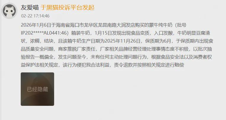新商悟注意到,2026年2月22日,一名消费者投诉称,2026年1月6日在海南大润发购买的蒙牛纯牛奶,生产日期为2025年11月26日,保质期6个月,却在1月15日发现“食品变质,入口发酸,牛奶明显豆腐渣状,浓稠,结块”;厂家至今未主动处理。
