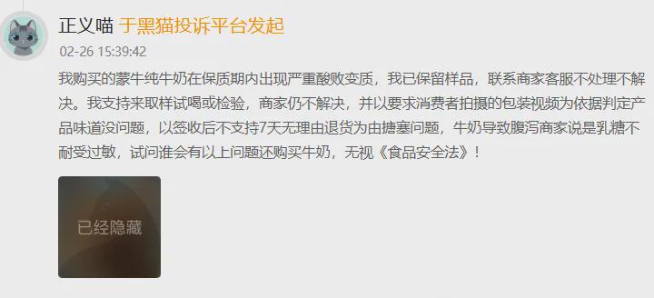 2月26日,另一名消费者投诉,购买的蒙牛纯牛奶在保质期内出现“严重酸败变质”,联系客服后不处理不解决。商家以“签收后不支持7天无理由退货”回应,消费者质问:“牛奶导致腹泻,商家说是乳糖不耐受过敏,试问谁会有以上问题还购买牛奶?”