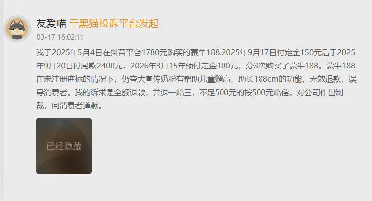 2026年3月17日,一名消费者在黑猫投诉平台投诉称,购买蒙牛一米八八奶粉花费3730元,认为商家“虚假宣传增高、欺诈消费者”,要求三倍赔偿。