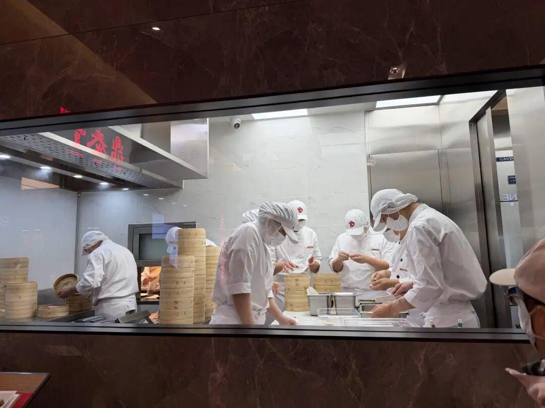内参君在中午12点来到鼎泰丰,正是用餐高峰期,门口电子屏不断跳号,店内约30桌已经满人,前面排号6桌,没有专门设有等位区。但门口有透明墙可以看到后厨。
