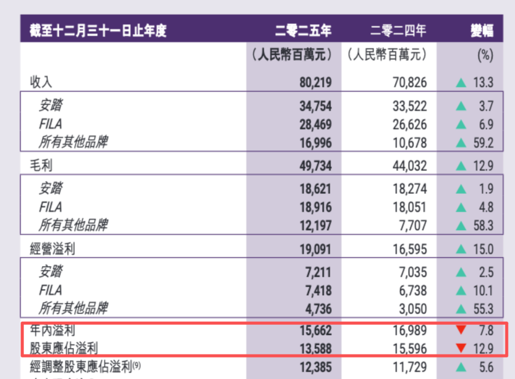 3月25日,安踏体育用品有限公司(ANTA,2020.HK,以下简称“安踏集团”)发布2025年全年业绩公告,去年业绩再创历史新高,高于市场预期。其中,收入同比增长13.3%至802.19亿元;股东应占溢利为135.88亿元,同比下滑12.9%,撇除2024年亚玛芬集团上市及配股有关会计影响后同比增13.9%;集团经营利润同比提升15%至190.91亿元;集团经营利润率同比上升0.4个百分点至23.8%。