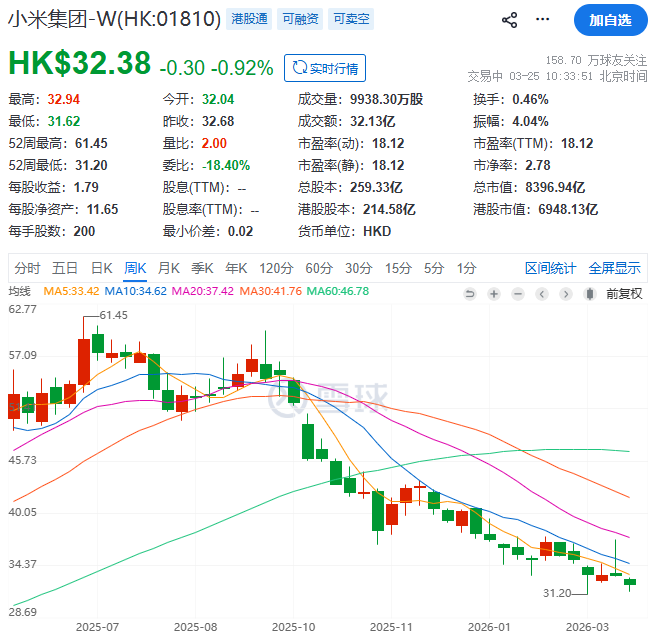 股价已经较去年高点回撤47%,今天上午,小米股价也是一直在水下震荡。