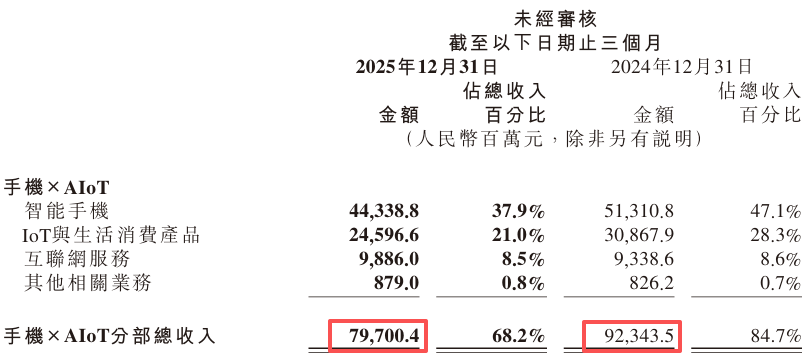 原因是,小米手机出货量减少、平均售价下降,也就是量价齐跌。