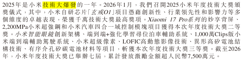 包括自研芯片玄戒O1、手机背屏、超强钢、汽车四合一域控制模块、小米AI眼镜等。
