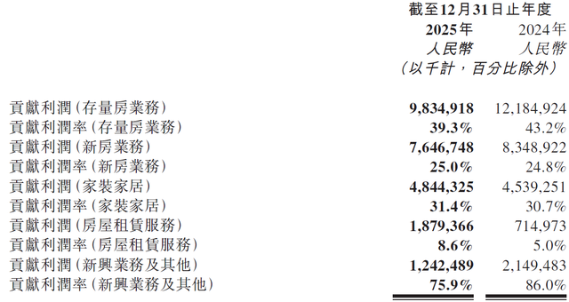 虽然家装家居业务收入154亿元(同比增长4.4%)和房屋租赁服务收入219亿元(同比暴增52.8%)成为亮点,但这两项业务的毛利率远低于传统房产交易。家装业务毛利率31.4%,租赁业务毛利率仅8.6%,而存量房业务毛利率为39.3%,新房业务为25%。