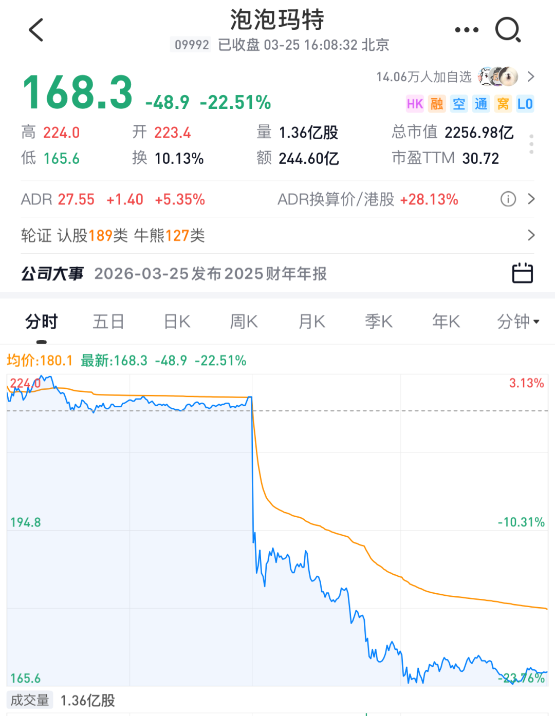 泡泡玛特午后股价闪崩。截至收盘,其股价跌幅22.51%,市值一天蒸发超500亿港元。