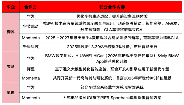 以上举措很大程度上是BBA联手华为、阿里、字节跳动等国内科技公司补课智能化的成果。下图为BBA与国内科技公司部分合作内容: