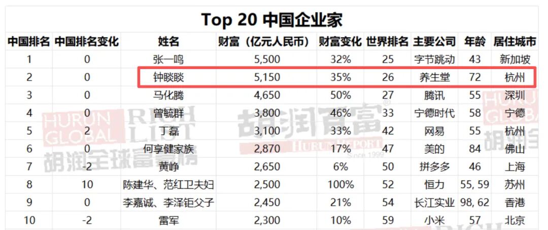 随着业务重回正轨,钟睒睒也回归低调,逐步淡出公众视野,公开发声频次少于舆论爆发当年。根据3月发布的胡润富豪榜,72岁的钟睒睒以5150亿元财富值(同比增长35%)位列中国企业家第二位。