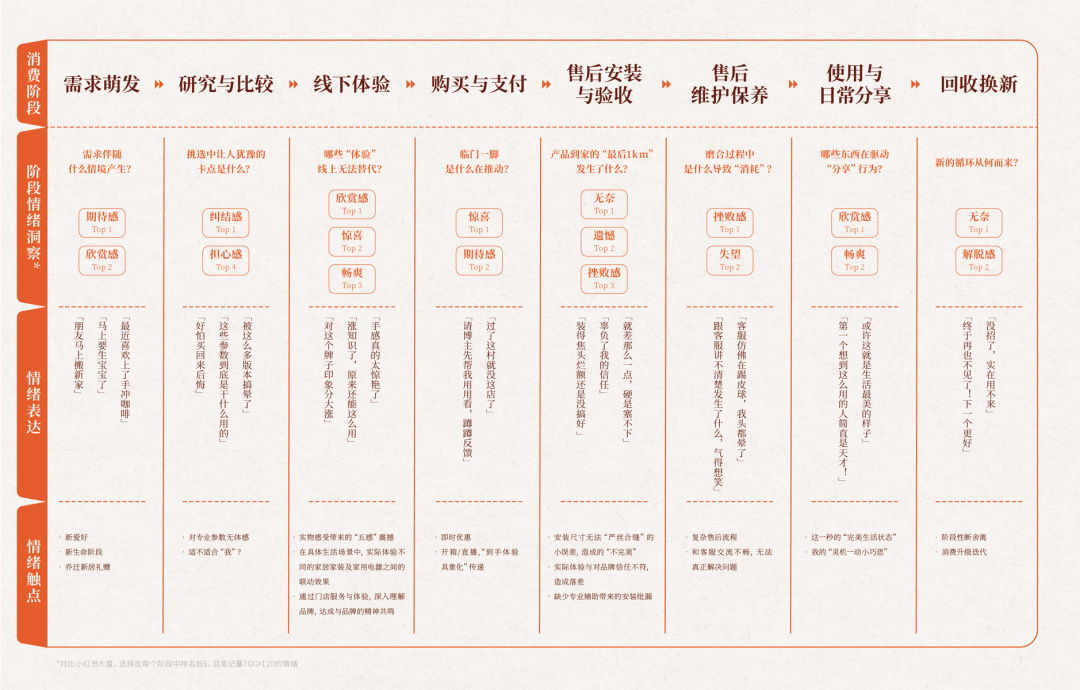 根据《2026家生活情绪需求洞察白皮书》构建的「家生活消费旅程情绪图谱」,从需求萌发、研究比较、线下体验、购买支付,到安装验收、维护保养、使用分享与回收换新,消费旅程的每一个节点上,都有具体的情绪在驱动用户的判断与行为。