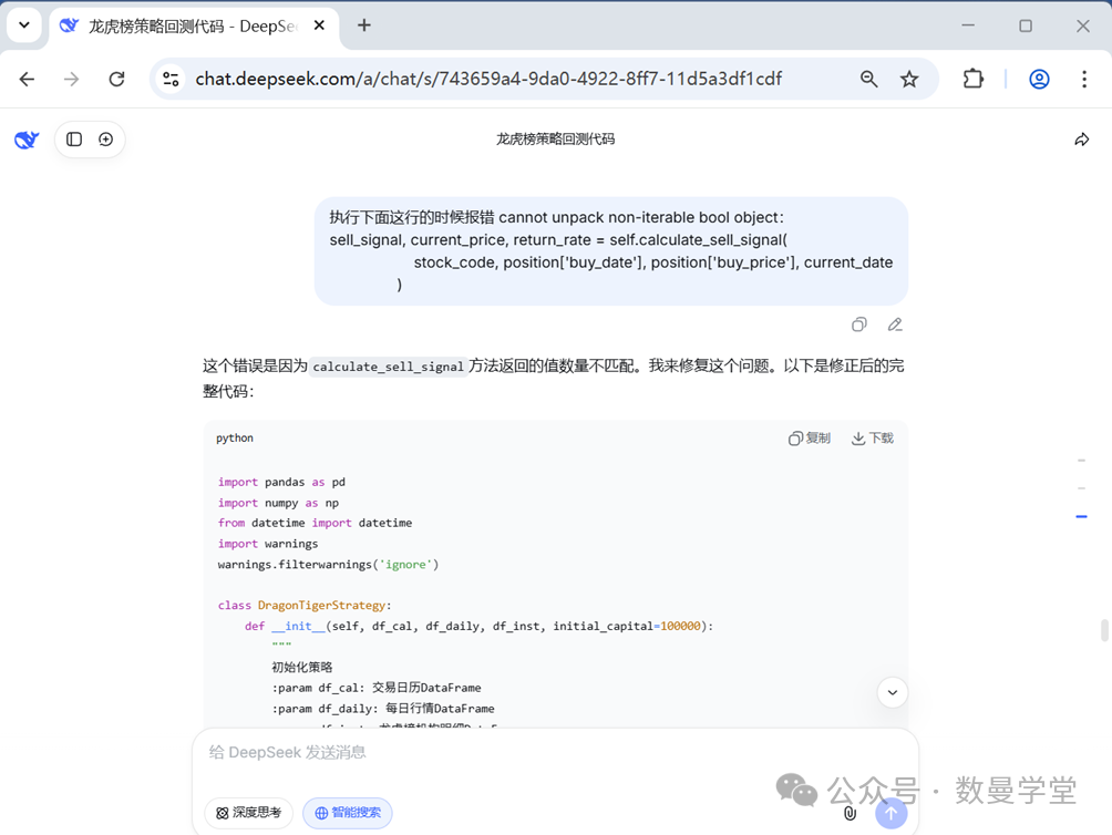 代码太长,报错信息也很专业。怎么办?别慌,这正是AI的强大之处。我把报错信息原封不动地“甩”给了DeepSeek AI,让它自己解决。