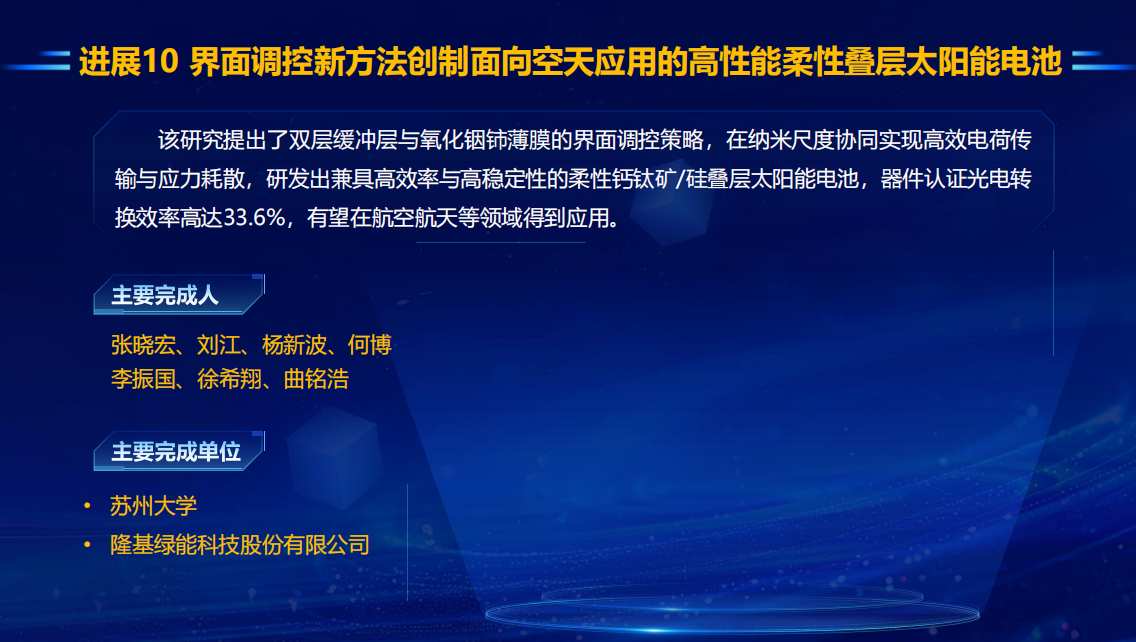 成果意义:攻克柔性叠层电池关键难题,为国家战略领域提供光伏能源解决方案,助力硅基光伏产业转型。