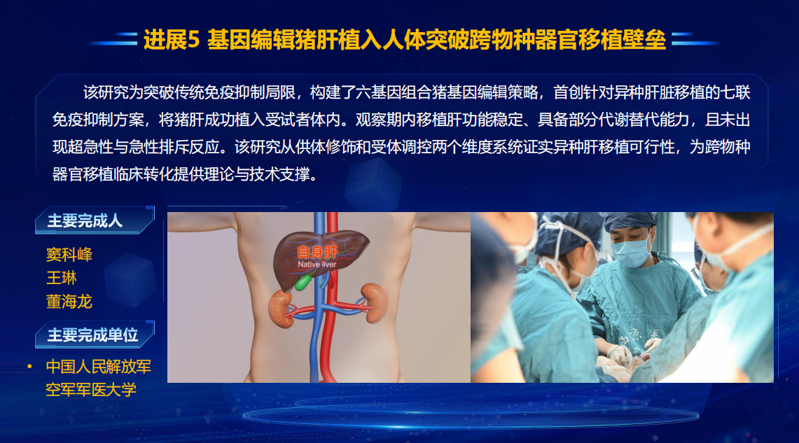 研究成果:团队利用CRISPR技术对供体猪基因改造,制定七联免疫抑制方案,采用异位辅助移植策略,实现基因编辑猪肝在人体内短期存活。