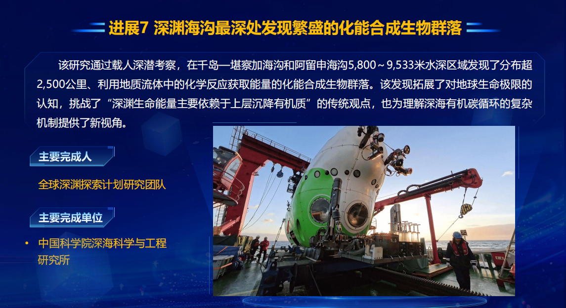 研究成果:中科院深海所团队在西北太平洋海沟发现深达9533米的化能合成生物群落及甲烷储库,挑战传统生命生存和碳循环观点。