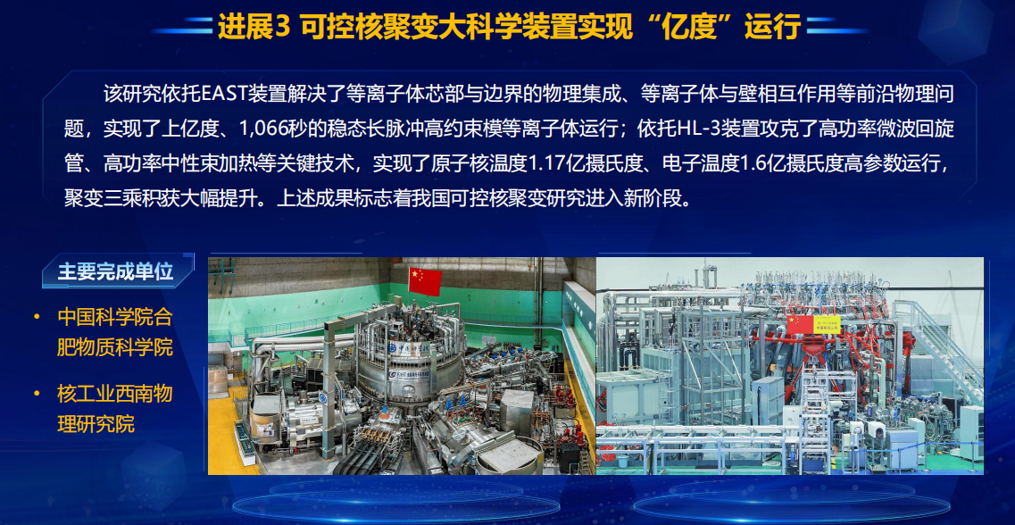 研究成果:中国科学院合肥物质科学研究院east装置实现上亿摄氏度1066秒稳态长脉冲高约束模等离子体运行;核工业西南物理研究院环流器三号装置实现原子核温度1.17亿摄氏度、电子温度1.6亿摄氏度高参数运行。