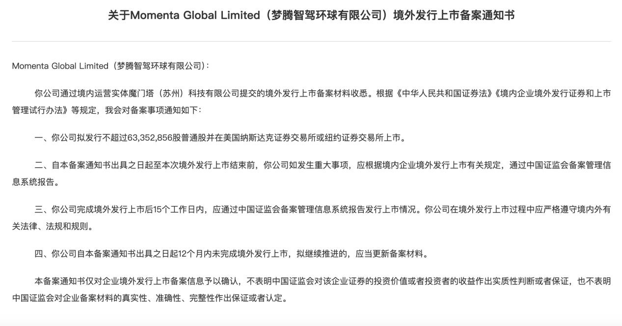 据此前媒体报道,Momenta的上市计划,最早追溯到2020年初,彼时,有消息称,Momenta考虑在美国或中国香港递表,目标是筹集10亿美元(约71亿元)。2024年6月,Momenta通过了中国证监会的境外上市备案,获准在美国纳斯达克或纽交所,发行不超过6335万股普通股。