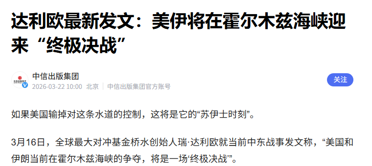 桥水基金的创始人达利欧就发出警告,他认为投资者不能太乐观,说这次中东大战无论如何收场,都已经颠覆了世界格局。