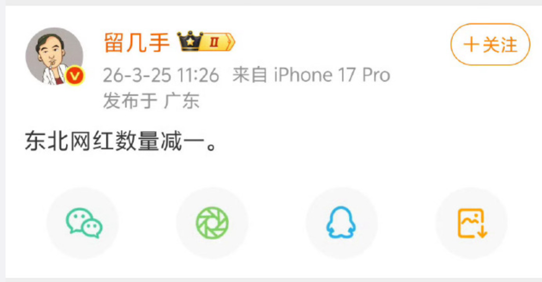 可这份沉痛的氛围还未散去,初代网红留几手便公然针对张雪峰的离世,发布了一句极其轻佻的评论:“东北网红数量减一。”