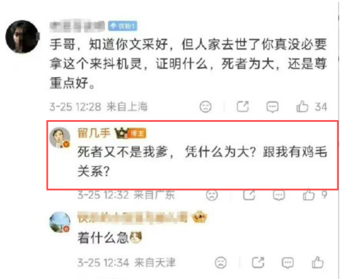 此言一出,立刻引来大批网友指责,不少人好心规劝,秉持“死者为大”的底线,不该在他人离世时出言不逊。面对网友的批评,留几手非但没有收敛,反而出言回怼,态度蛮横无礼:“死者又不是我爹,凭什么为大?跟我有鸡毛关系?”