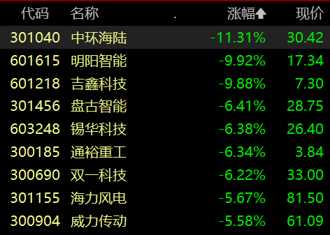 风电设备板块走低,中环海陆跌超11%,明阳智能、吉鑫科技跌超9%。