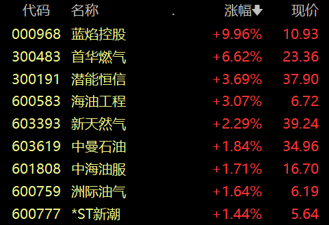 具体来看,油气板块震荡拉升,蓝焰控股涨停,首华燃气涨超6%,潜能恒信、海油工程、新天然气等股跟涨。