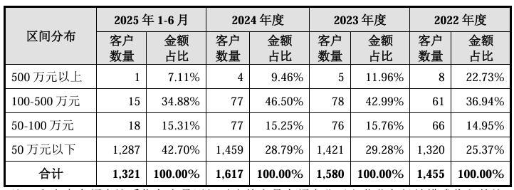 报告期各期,正大种业主营业务经销模式下的客户销售区间分布较为稳定。其中,交易额50万元以上的客户贡献收入较高,占比分别为74.63%、70.73%、71.21%和57.30%,除2025年1-6月外,占比均超过70%。