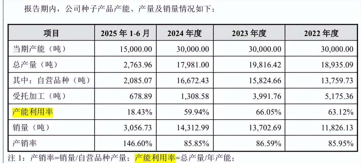 从产能利用率上看,公司的产能利用率持续位居低位,报告期未超过67%的线,2025年上半年仅18.43%。报告期内,公司在湖北省襄阳市、云南省玉溪市、甘肃省张掖市建立种子加工厂,年产能为3万吨。报告期内,公司种子产能利用率较低,公司解释主要系农作物种植存在显著的季节性特征;2022至2024年,公司玉米种子的产销率在85%左右,生产与销售情况相对匹配。
