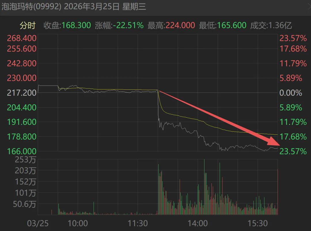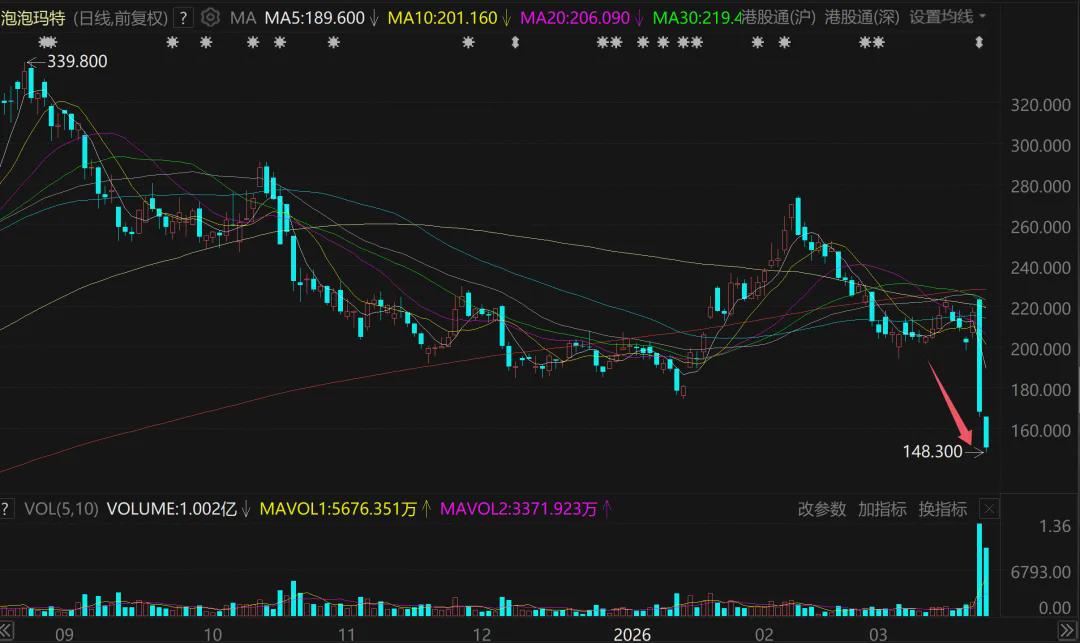 3月26日,泡泡玛特再度暴跌10.46%,两天跌幅累计高达30.55%。