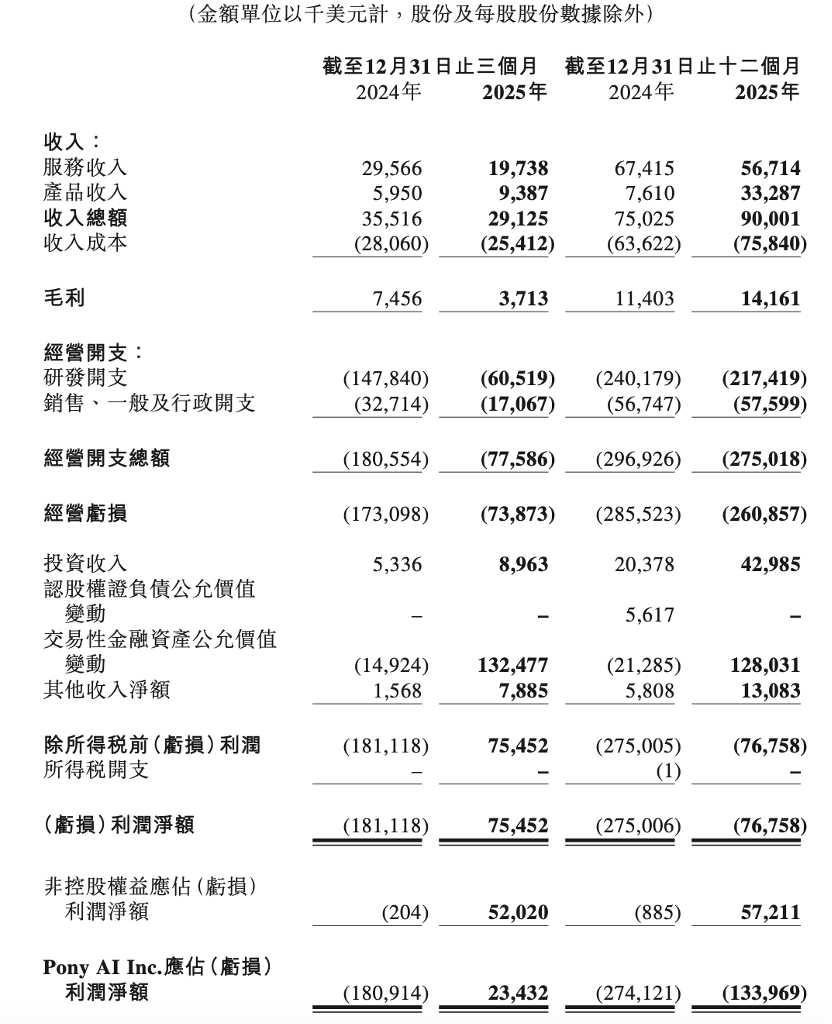 该公司也首次实现了单季度盈利。财报显示,小马智行2025年第四季度实现归母净利润2343.2万美元(约合人民币1.62亿元),而2024年同期为亏损1.81亿美元。不过该公司强调,公司季度盈利得益于战略投资的成功。