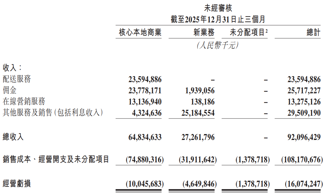 2026年3月26日,这位外卖巨头发布了2025年第四季度及全年财务报告。尽管早有亏损预期,但当233.6亿的亏损数据落地时,还是有一丢丢惊讶,毕竟此前三季报显示其前三季度净亏损82.11亿。