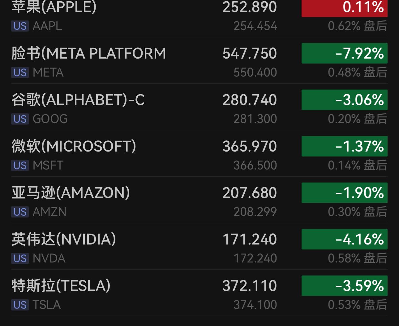 大型科技股整体走弱,特斯拉下跌3.59%,亚马逊跌1.97%,微软跌1.37%;苹果则小幅收涨0.11%。