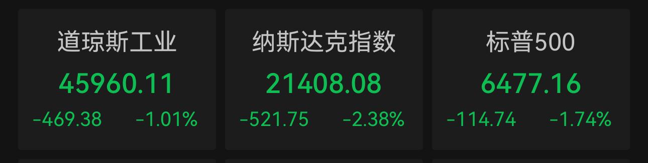 截至收盘,道琼斯工业平均指数下跌469.38点,收于45960.11点,跌幅为1.01%;标准普尔500种股票指数下跌114.74点,收于6477.16点,跌幅为1.74%;纳斯达克综合指数下跌521.75点,收于21408.08点,跌幅为2.38%。纳指与标普500指数创下自1月20日以来的最大单日跌幅。