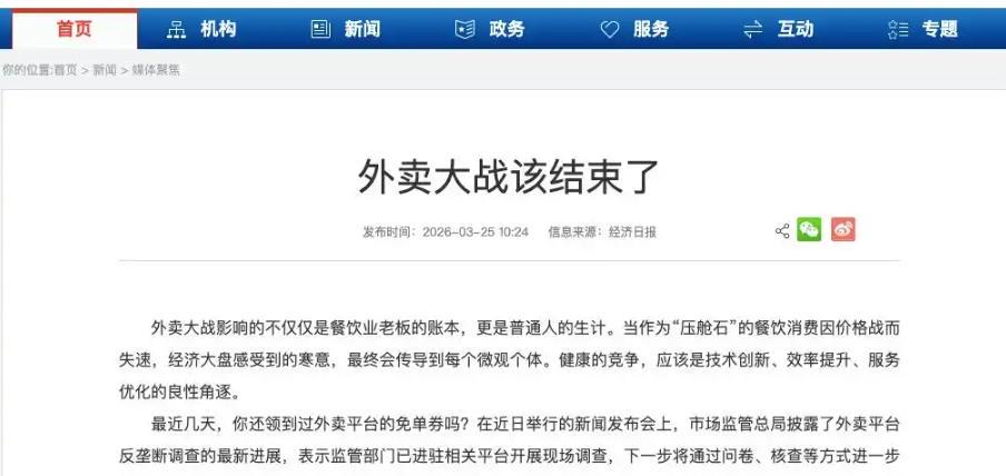 据媒体报道,3月25日,经济日报刊登了评论员文章《外卖大战该结束了》。