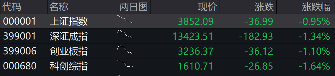 沪指低开0.95%,深成指低开1.34%,创业板指低开1.10%,科创综指低开1.64%。