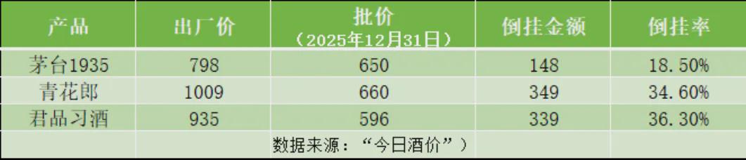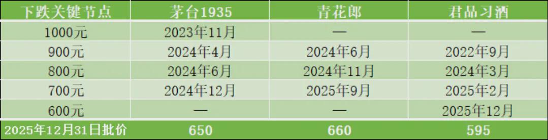 “今日酒价”数据显示,2023年11月,茅台1935的批价首次跌破1000元/瓶关口;2024年4月跌破900元/瓶,6月跌破800元/瓶,12月跌破700元/瓶;到2025年12月31日,批价已跌至650元/瓶。截至发稿,其批价依然稳定在650元/瓶。