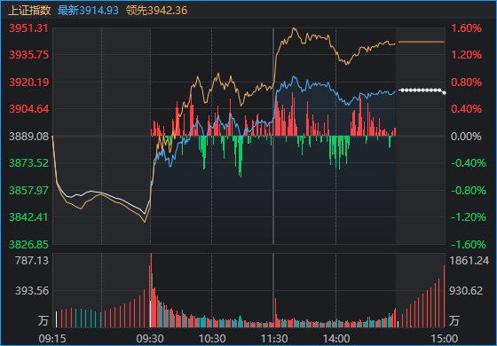更神奇的一幕发生在13:00——午后开盘的第一分钟,全市场无差别放量拉升,情绪瞬间点燃。后续交易时段,这段涨幅也大致被维持到了收盘。