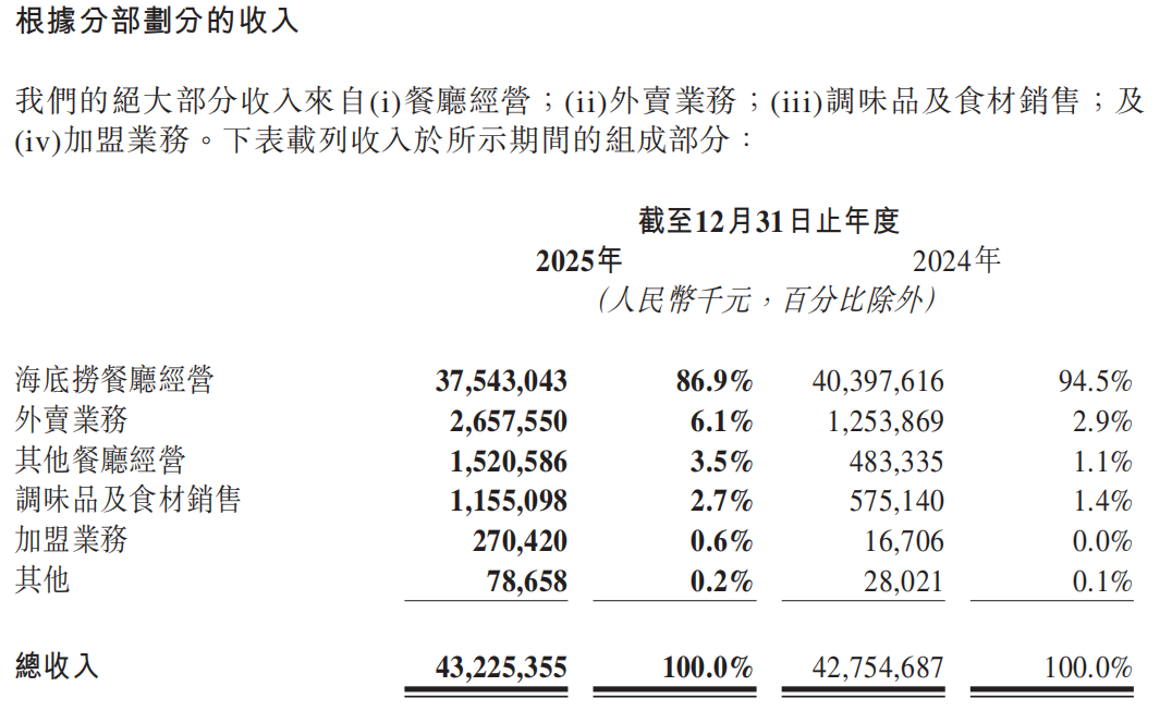 财报显示,海底捞餐厅经营收入从2024年的403.98亿元降至375.43亿元,同比减少7.1%,占总营收比重也从94.5%收缩至86.9%。