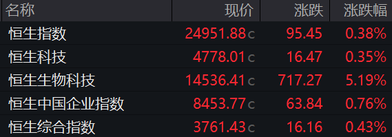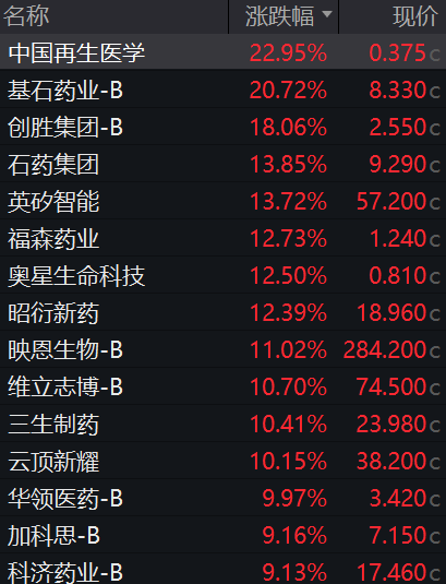 医药生物板块领涨,中国再生医学涨超22%,基石药业涨超20%,石药集团涨超13%,三生制药涨超10%,恒瑞医药涨超7%。