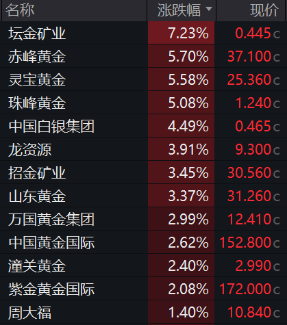 贵金属板块走高,坛金矿业涨超7%,赤峰黄金、灵宝黄金、珠峰黄金涨超5%,山东黄金涨超3%。