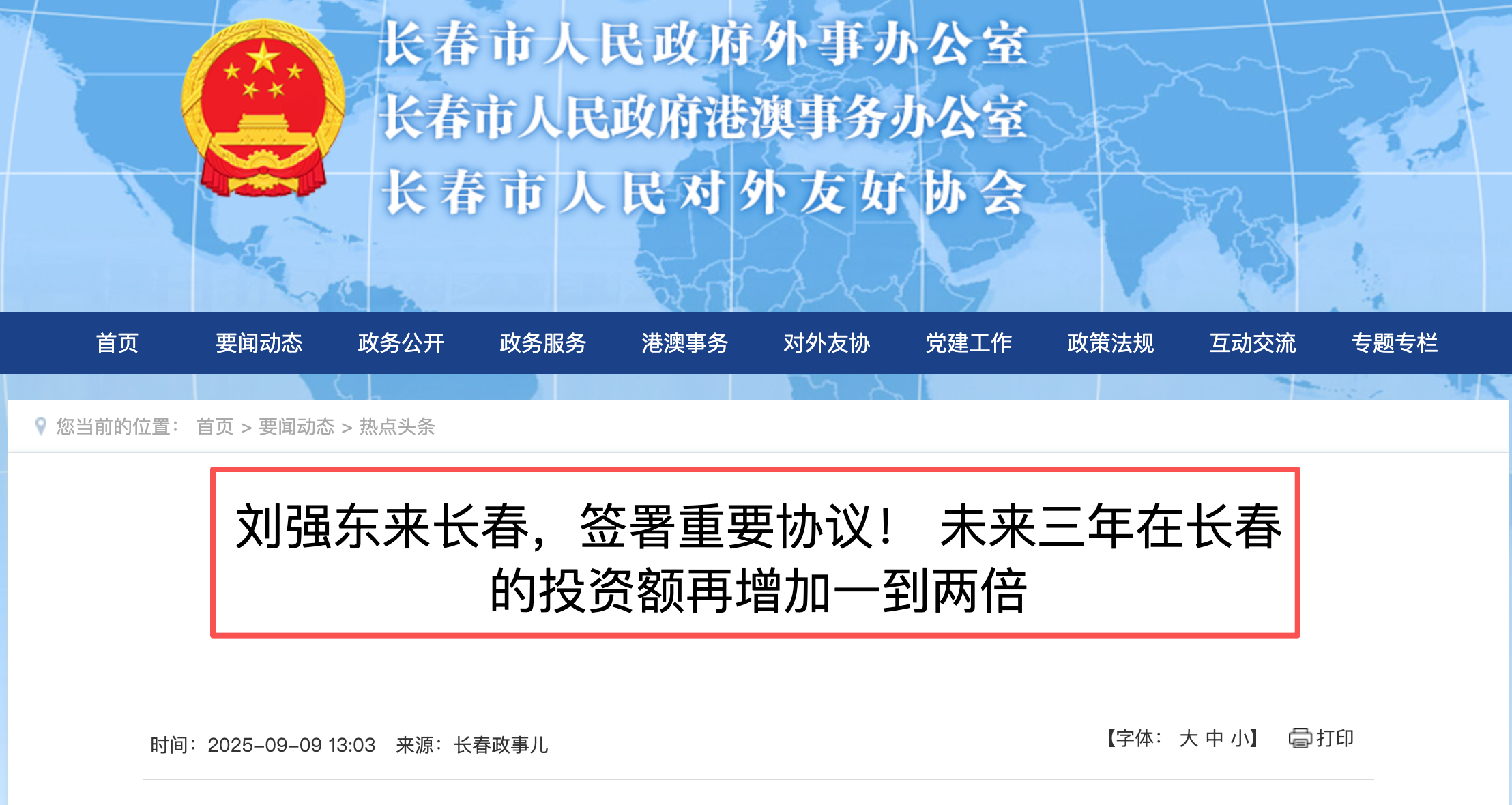 吉林长春政府部门官网刊登的新闻报道称:“刘强东来长春,签署重要协议!未来三年在长春的投资额再增加一到两倍。”