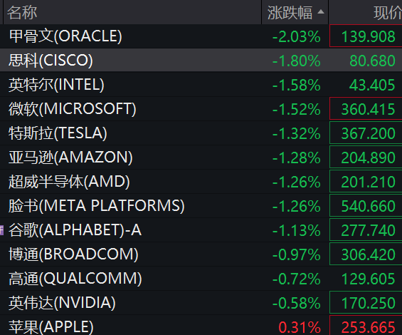 美股科技股多数下跌,甲骨文跌超2%,思科、英特尔、微软、特斯拉、亚马逊跌超1%。