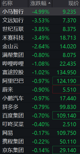 热门中概股再度下跌,小马智行跌近5%,文远知行、禾赛科技跌超3%,金山云跌超2%,蔚来、阿里巴巴、百度集团、京东等集体低开。