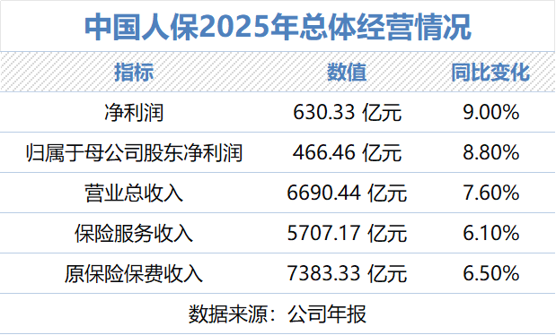 年报显示,2025年中国人保实现净利润630.33亿元,同比增长9.0%;归属于母公司股东净利润466.46亿元,同比增长8.8%。